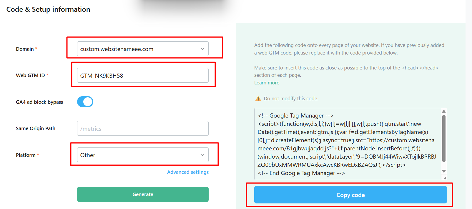 现在在第一部分,请选择你的域名。在下一个选项中,请输入你的 GTM ID,打开 “GA4 广告拦截绕过”,然后生成。