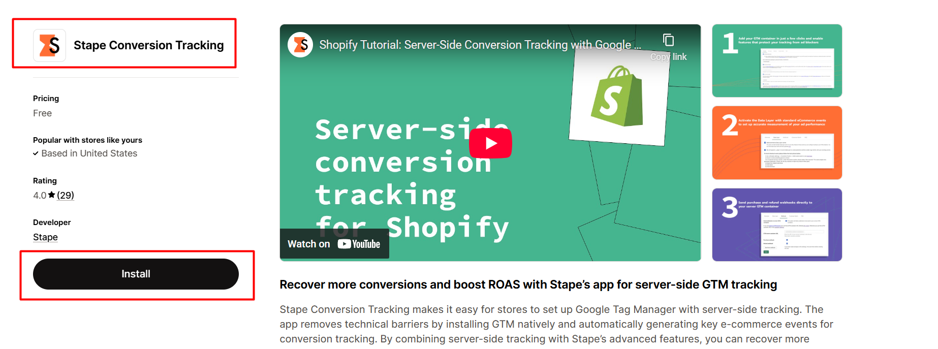 我们的第一种方法是使用 Stape 应用。通过 Shopify 商店中的这个应用,我们可以完美地启用数据层。而且它是完全免费的。