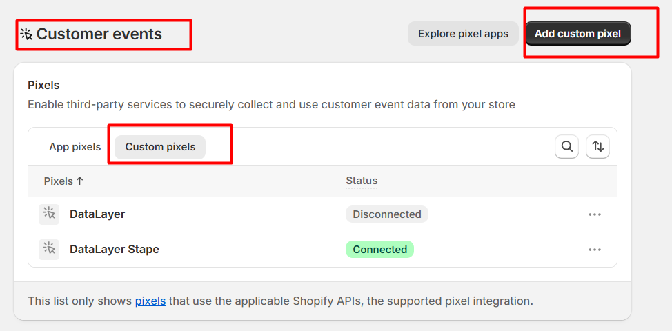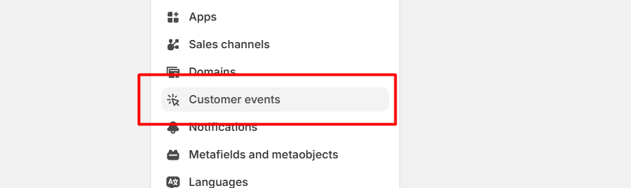 复制代码后,首先在你的 Shopify 设置中导航到此位置。在这里,与之前一样,你需要创建一个“自定义像素(custom pixel)”。