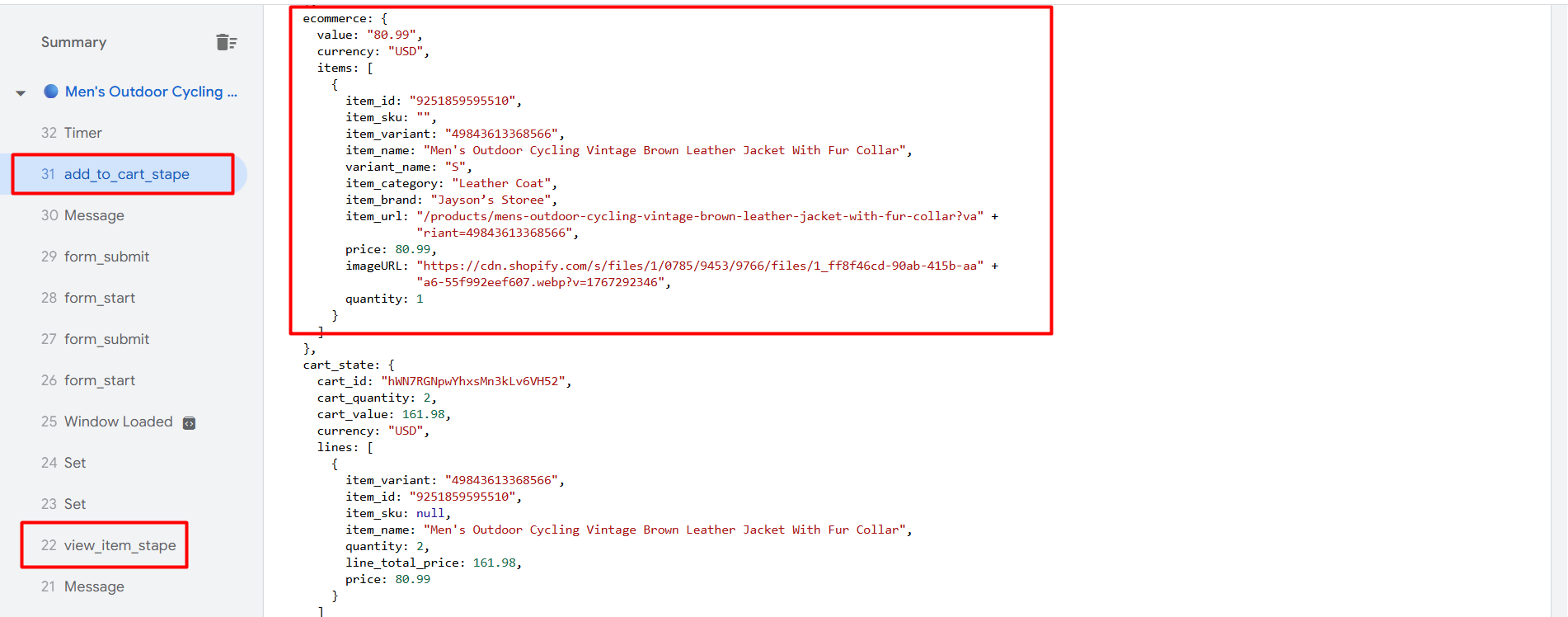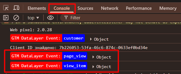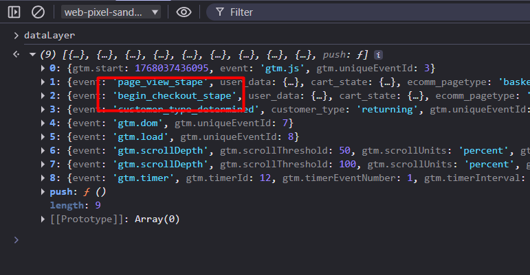 现在,你可以通过 GTM 预览模式进行检查。届时,你需要像之前查看结账和购买事件那样,在控制台(Console)部分识别所有事件。不过这一次会更简单;进入控制台后,在操作完成后你将能够看到所有目标事件。