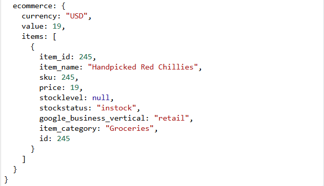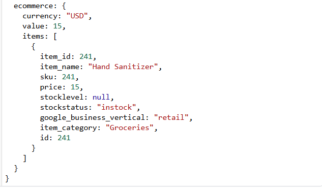 但是,“ecommerce.items.0.item_id”中的“0”是指数组中项的索引。在数组中,第一个项的索引从 0 开始。因此,“0”意味着我们正在访问 items 数组中的第一个产品。如果有更多产品,第二个项用 1,第三个用 2,依此类推。