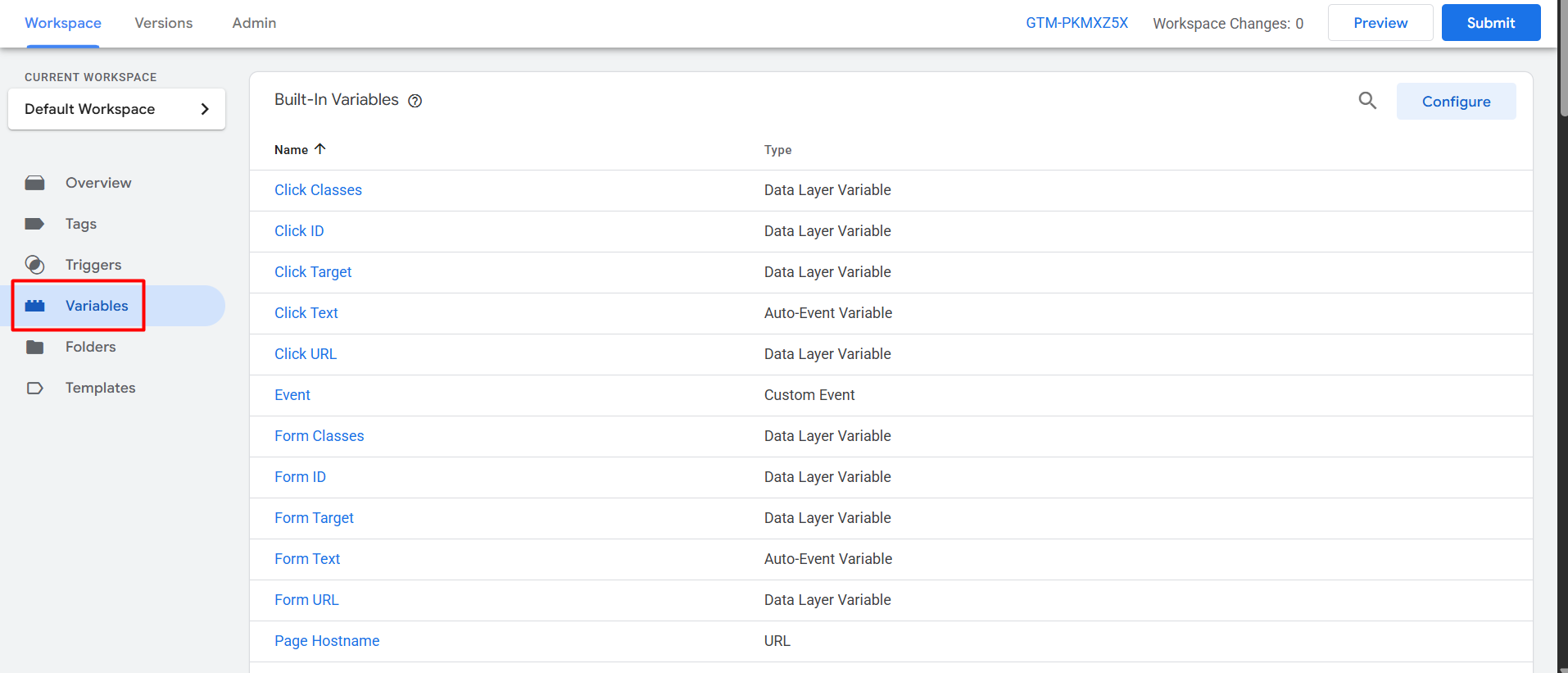 要创建一个变量,进入您的 GTM 并点击变量部分。
