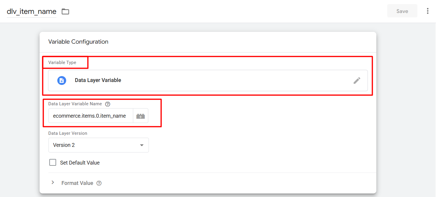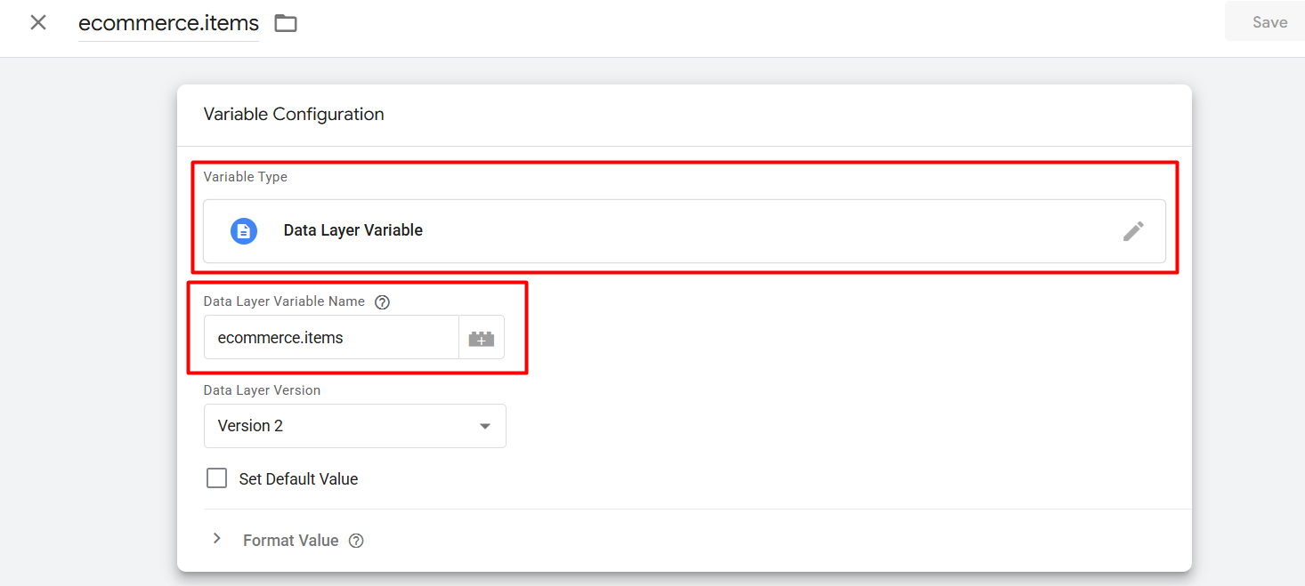 接下来,点击变量类型并输入您的“数据层变量名称”。如果您使用它,那么就能获取完整的项数组。