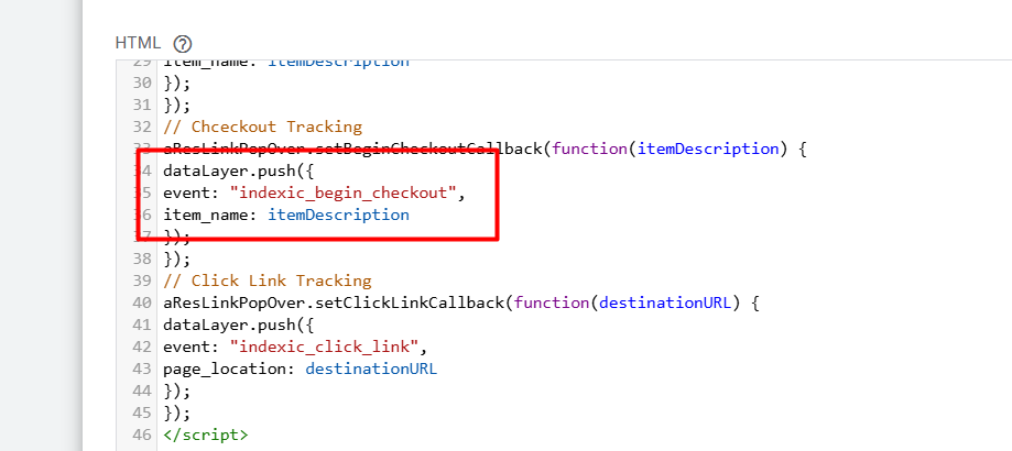 查看这段代码;每当有人完成结账时,事件名称就会被推送到数据层(Data Layer)中,该事件名称为“indexic_begin_checkout”。