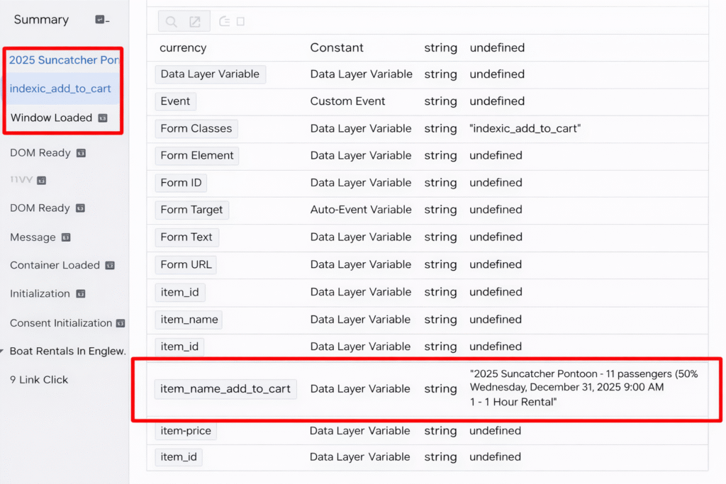 在这里你可以看到,当在 Indexic 预订表单中完成“加入购物车(Add to Cart)”操作后,数据层会以“indexic_add_to_cart”的名称记录该数据,同时还会收集商品名称。