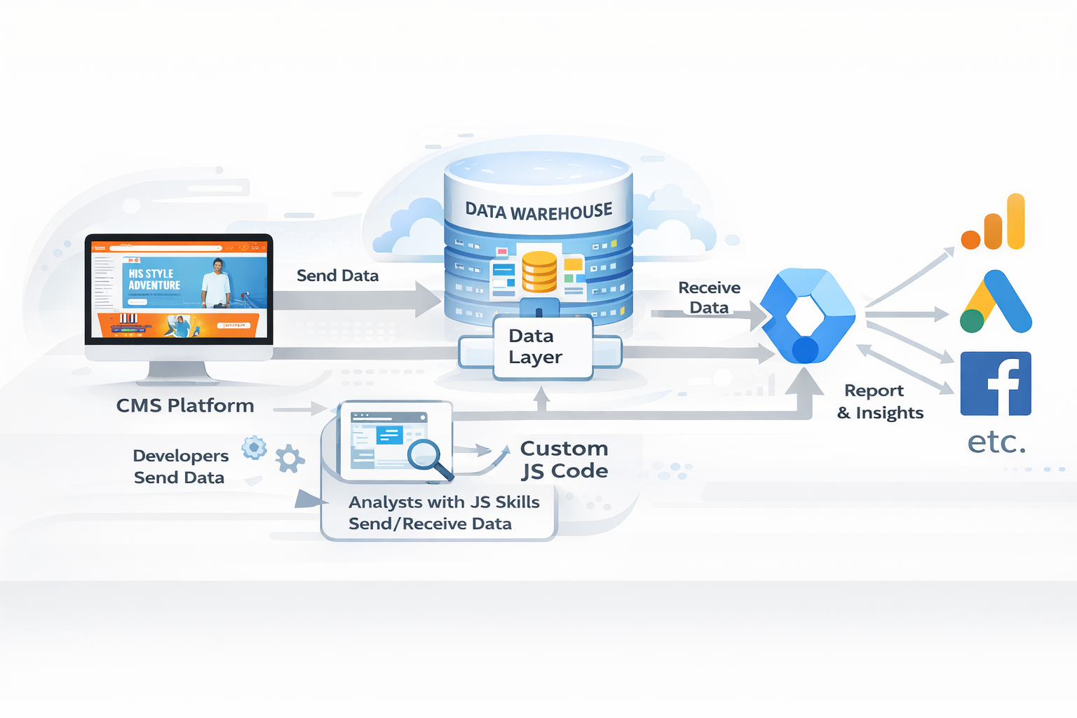 总结来说,整体的数据流如下:首先,你需要通过插件、应用程序或自定义方法从你的网站发送数据。然后,数据层将为 Google Tag Manager 存储数据。设置完成后,接下来就是将所有数据从数据层发送到你所需的位置。