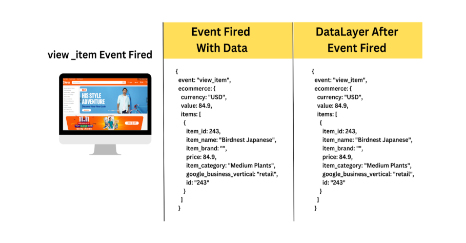 但请考虑一下:某人访问了你的产品页面。一旦“view_item”事件完成,你的设置将把事件名称发送到数据层。同时,与你的事件名称相关的所有产品数据也将被发送到数据层。图示说明了这一过程。