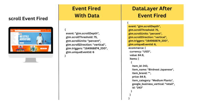 此时,你的数据设置将把一个额外的事件名称发送到数据层。同时,与你的事件一起,你的设置将再次发送与之前相同的数据。你可以在图中查看这个过程。