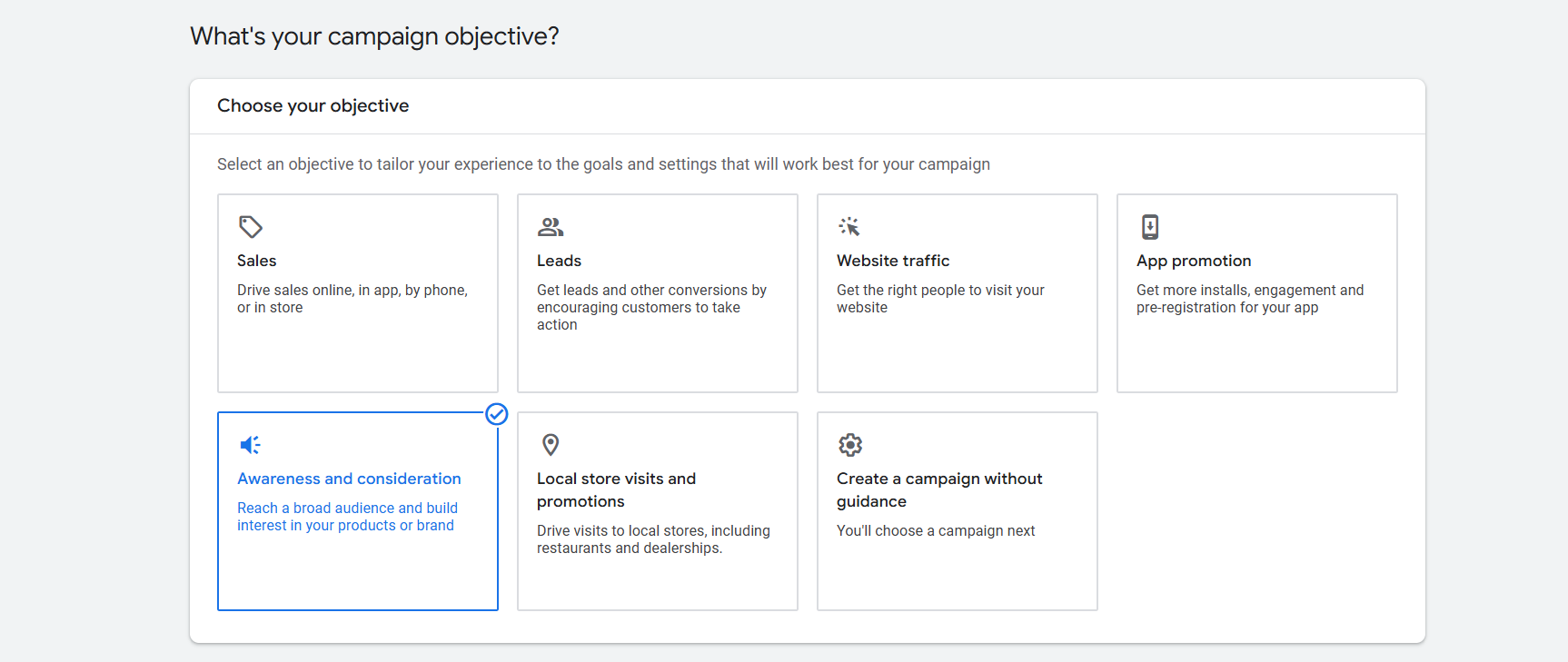 在这里,你需要选择广告目标。如果你对各个目标不太了解,可以先阅读这篇文章。Google 广告活动对象和类型概述