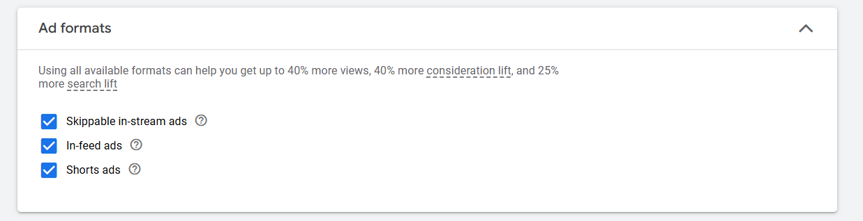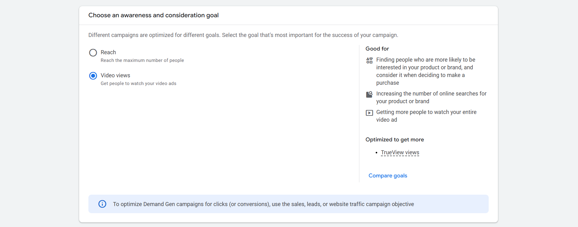 通过这种方式,谷歌可以帮助你触达更广泛的受众,同时“视频观看量”选项还能确保广告反复展示给已经表现出兴趣的用户。这种方法尤其适用于品牌认知推广和再营销活动。