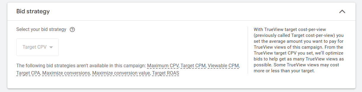 在出价设置中,我们需要选择自己的目标或投放重点。这里的出价策略“目标 CPV(Target CPV)”指的是“每次观看成本(Cost Per View)”,并且该出价策略是不可更改的。
