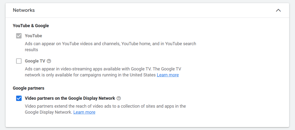 在这里,你可以选择广告的展示位置。你可以选择将广告展示在 Google 展示广告网络中的视频合作伙伴上,该网络由 Google AdSense 和 AdMob 组成。如果你希望广告出现在该网络中,只需勾选该选项;如果不需要,则可以不选。