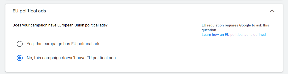 如果你正在投放政治广告,请务必选择“是(Yes)”选项;如果你未在欧盟范围内投放政治广告,则可以选择“否(No)”选项。