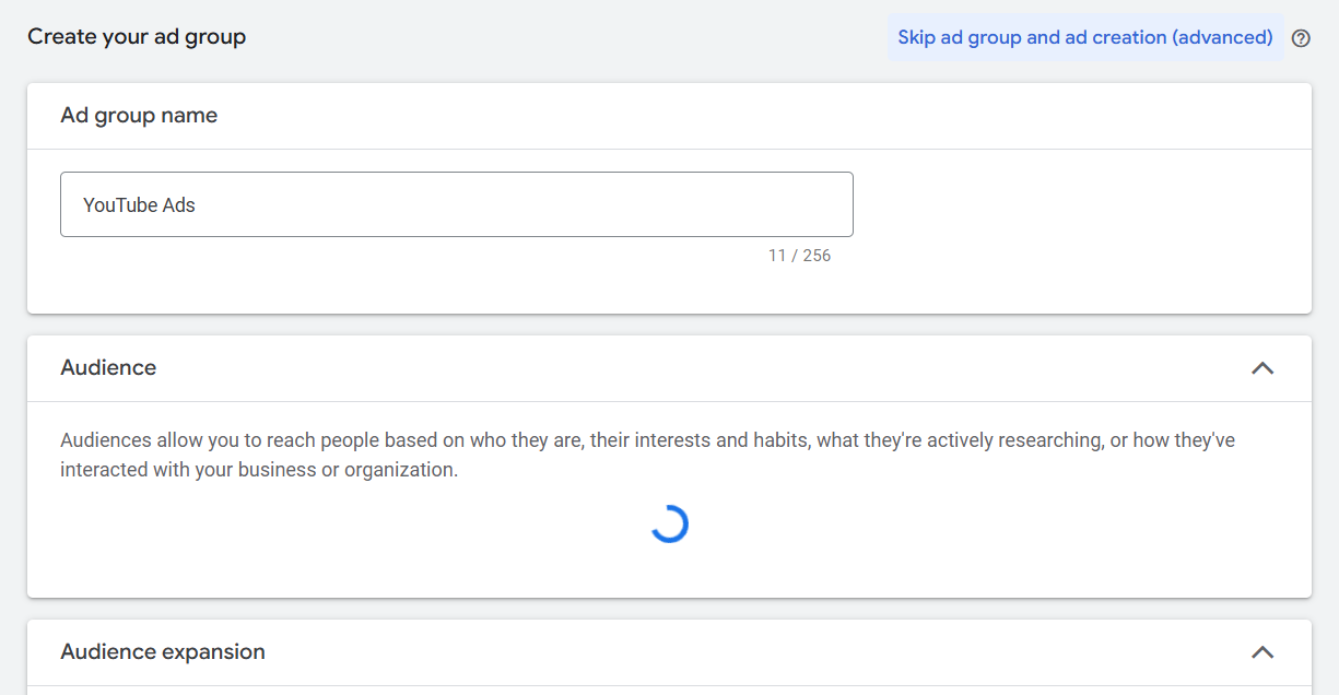 在广告组中,填写广告组名称后,你需要设置自定义受众。如果你不熟悉受众设置部分,可以阅读这篇文章获取更详细的说明。然后开始创建受众。Google Ads 受众定向解释