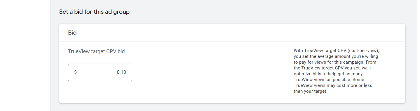 在 TrueView 目标 CPV(每次观看成本)出价模式下,你可以决定自己愿意为广告系列中的每一次观看平均支付多少费用。谷歌会根据你设定的金额自动调整出价,以尽可能为你获取更多观看次数。实际的单次观看成本可能会高于或低于你所设定的价格。